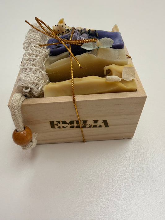 Artisan Soap Gift Set from Emilia Soy Aromas. Each wooden box includes: 4 full-size artisan...