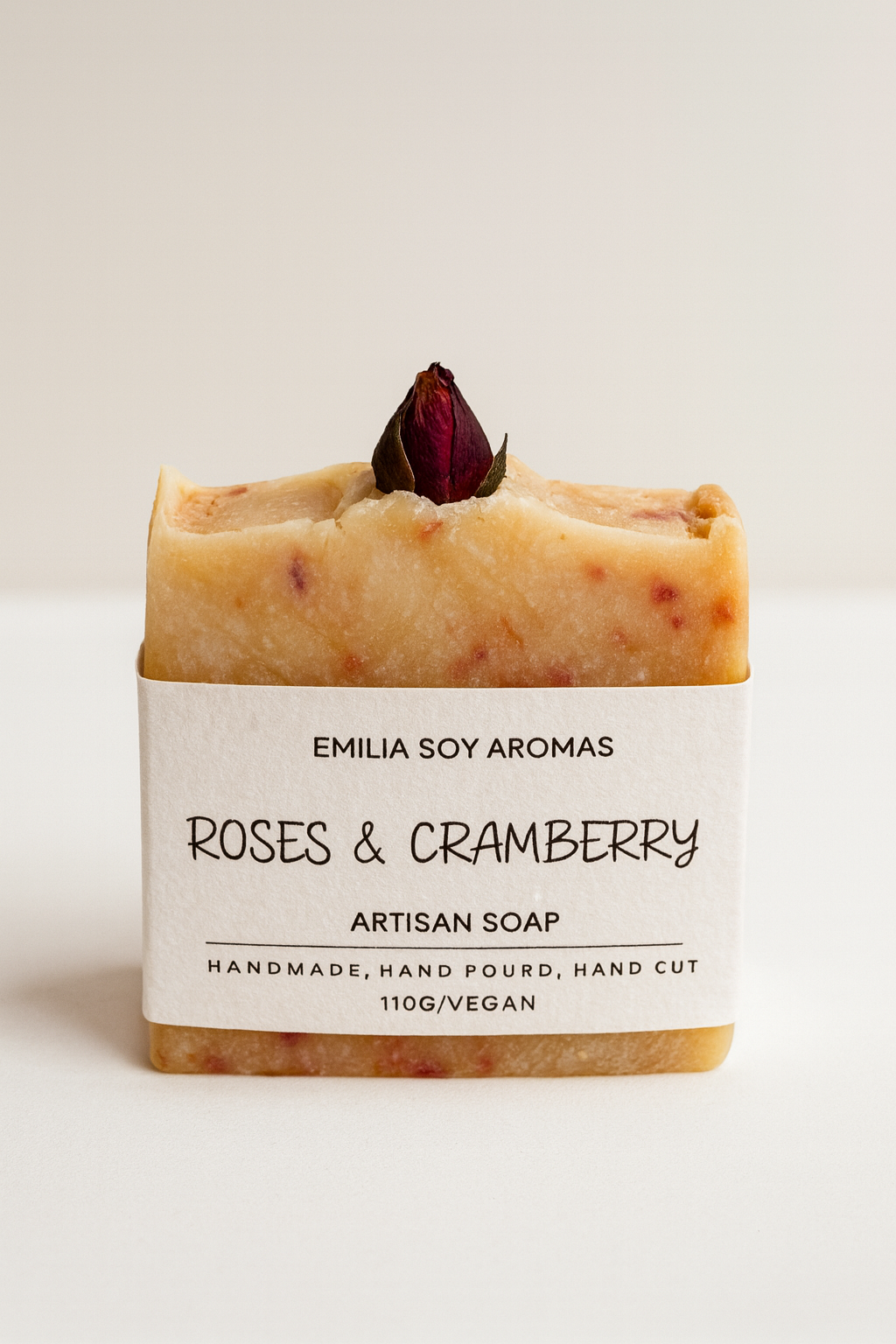 Our Roses & Cranberry artisan soap is made with creamy goat milk for a rich, velvety lather that leaves the skin feeling soft and pampered. A romantic blend of rose petals and juicy cranberry fills your shower with a sweet, floral-fruity aroma, while the hand-decorated rosebud on top adds the perfect elegant touch. Each bar is handmade, hand poured and hand cut in small batches at Emilia Soy Aromas.